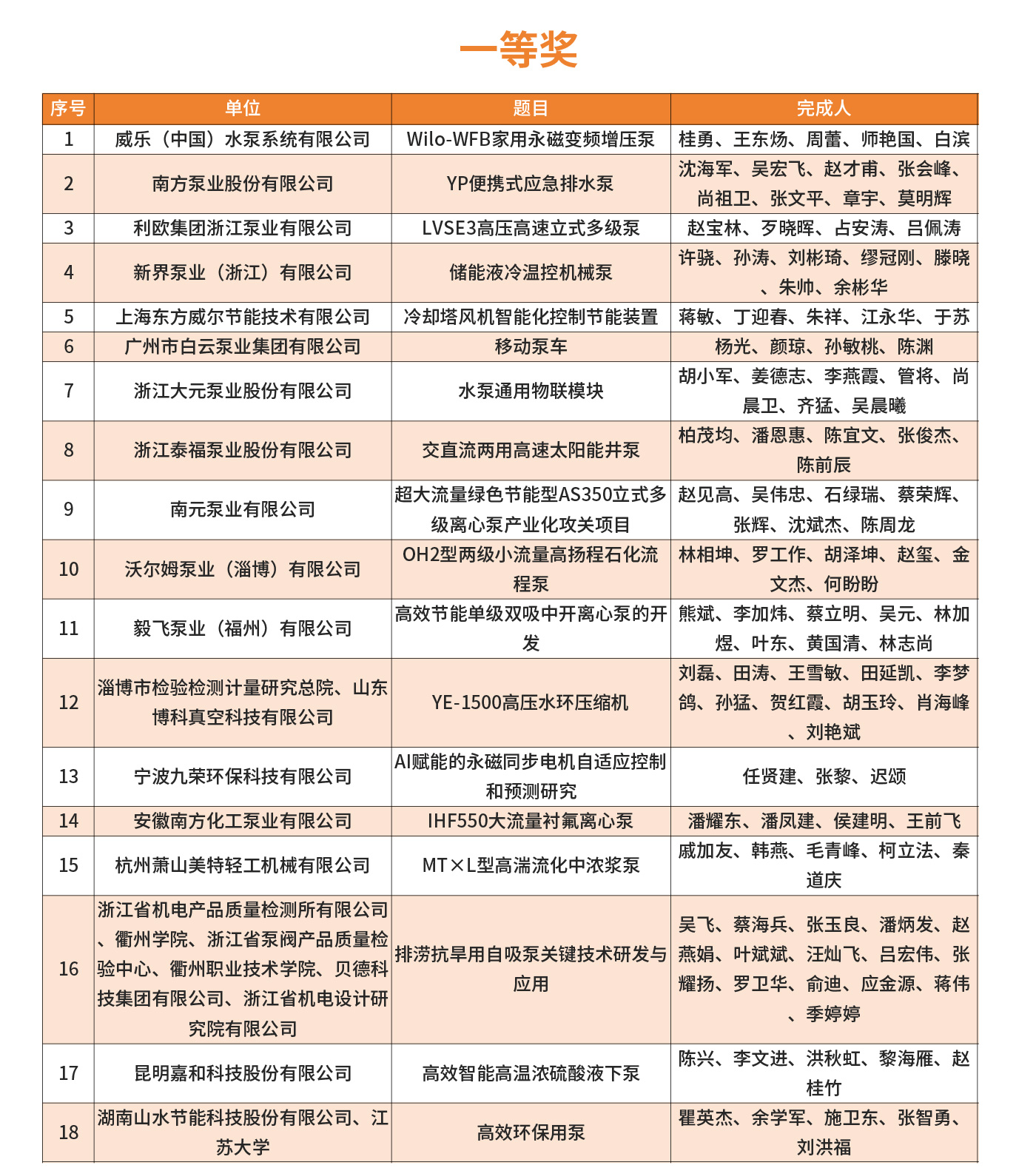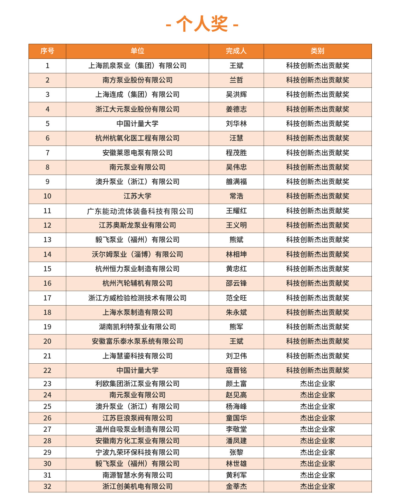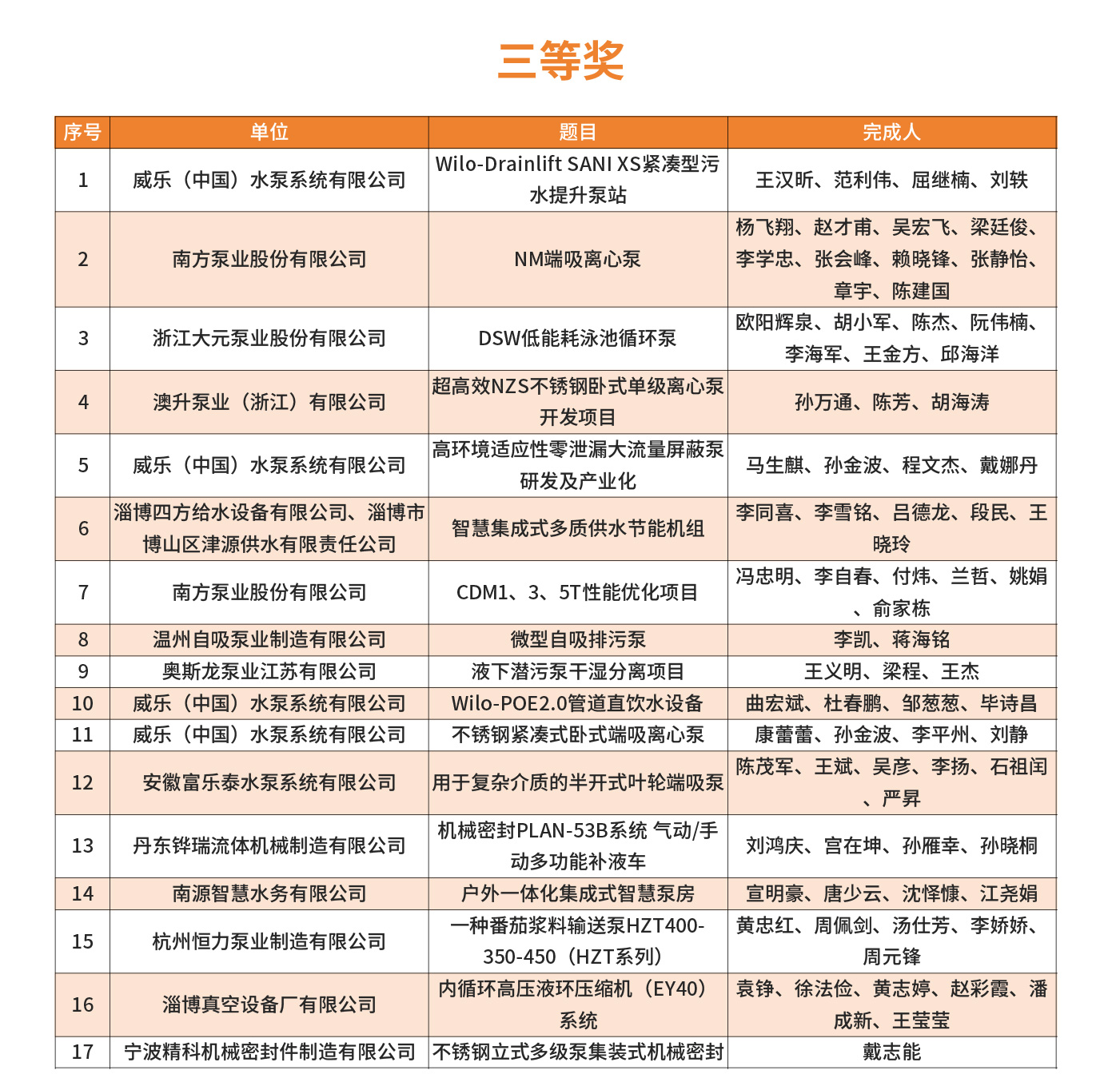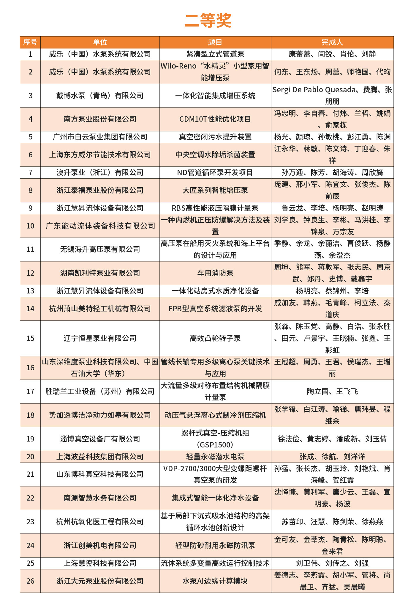 2025年第四屆FLOWTECH CHINA全國流體裝備技術創新獎經過10位嘉賓的專業評審,共評選出了威樂、南方、利歐、新界、白云、沃爾姆、澳升等在內的一、二、三等獎,凱泉泵業王斌、南方泵業蘭哲、利歐集團顏土富等32位個人獎。
